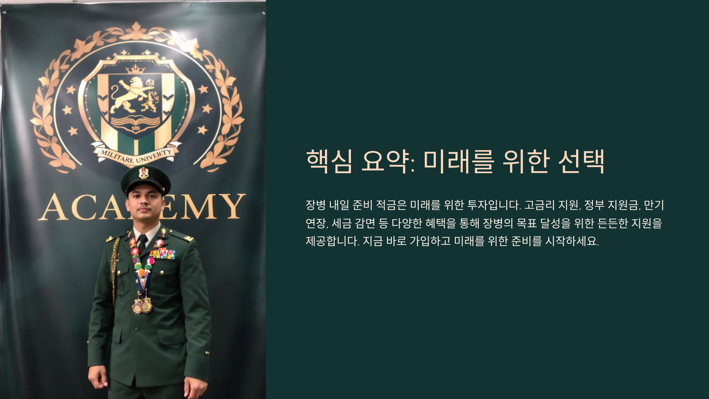 장병내일준비적금은 단순히 저축하는 것을 넘어, 장병 여러분의 미래를 준비하는 최고의 선택이 될 것입니다. 지금 바로 가까운 은행에서 상담받고, 안정적인 미래를 위한 준비를 시작하세요! 😊