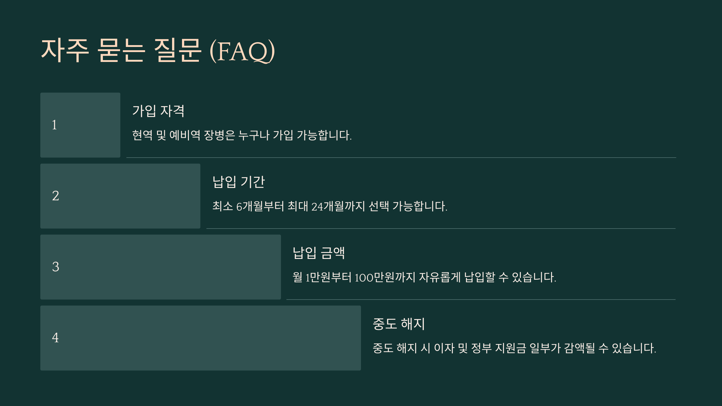 - 유연한 가입 방식: 신병교육대 또는 자대 배치 후 은행 방문 가입 가능