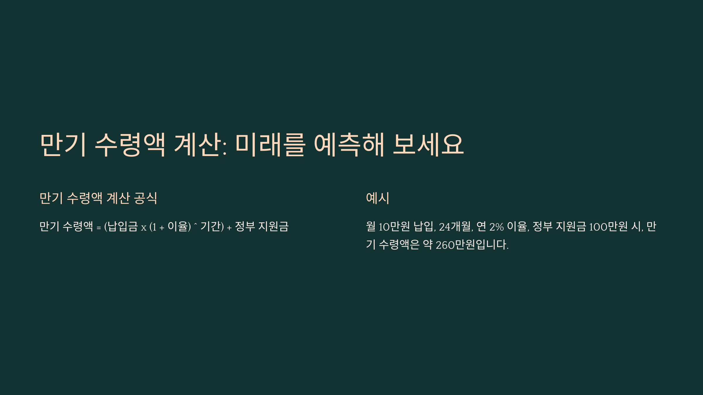 - 정부 매칭 지원금 제공: 납입 원금의 100%를 추가 지원